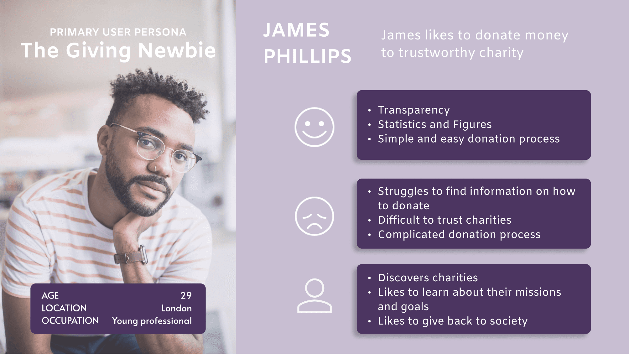 Based on user research, we created James Phillips, a 32-year-old professional passionate about transparency and simplicity in charitable donations.